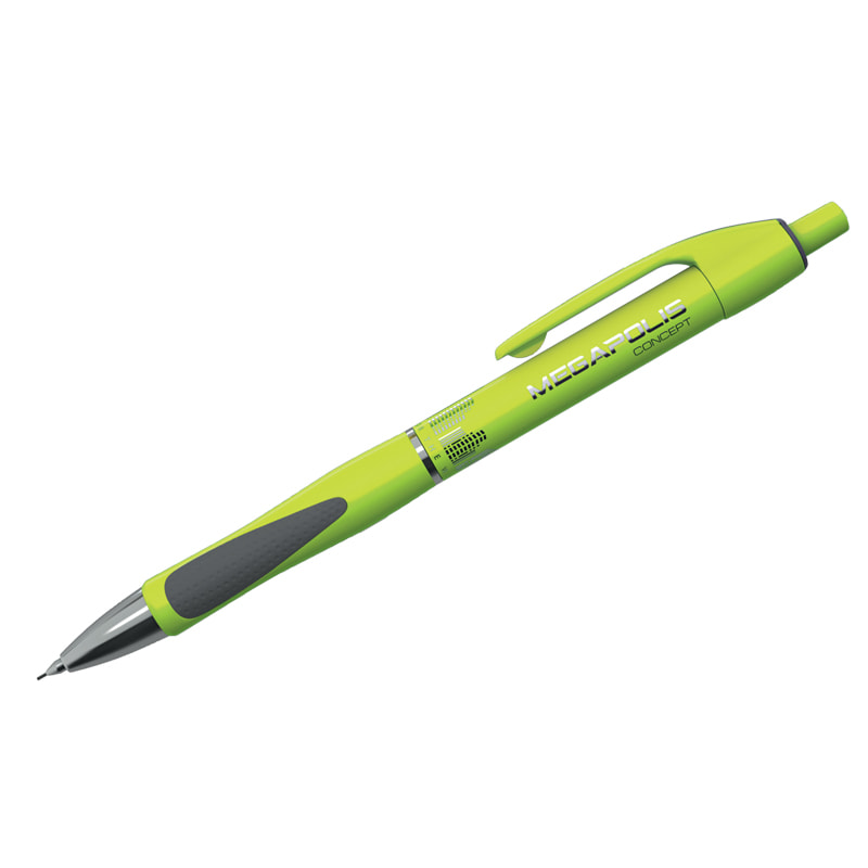 Описание Механический карандаш с металлическим наконечником и убирающейся цангой. Карандаш имеет круглый неоновый корпус с эргономичной грип-зоной, оснащенной двумя резиновыми вставками